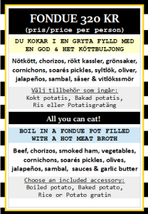 Köttfondue, finns ej som vegetariskt. No vegetarian options to the meat fondue.