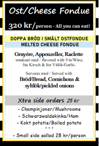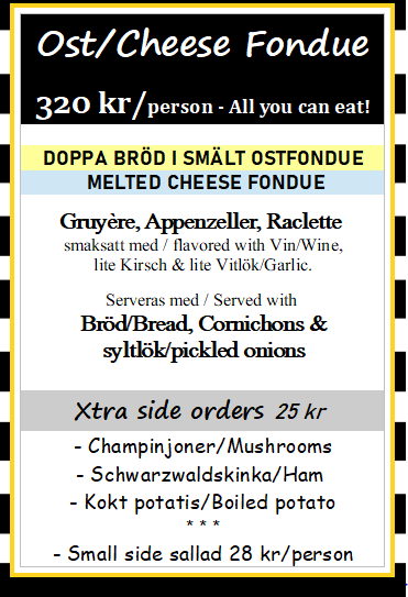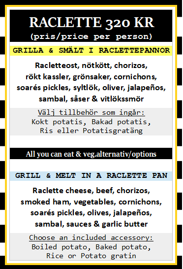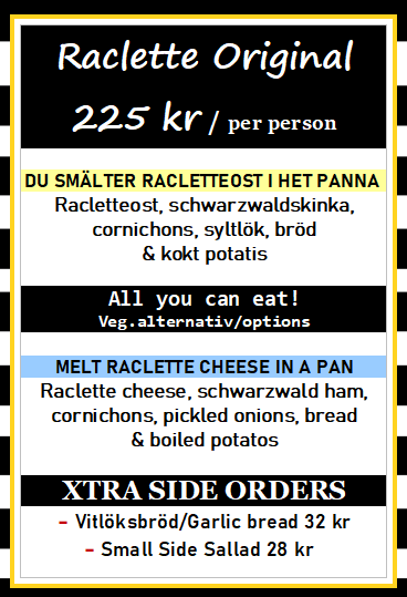 OBS! Vegetariska /veganska alternativ finns till våra Raclettemenyer, ej till vår Köttfonduemeny. Potatisgratäng finns dock inte som veganskt alternativ.